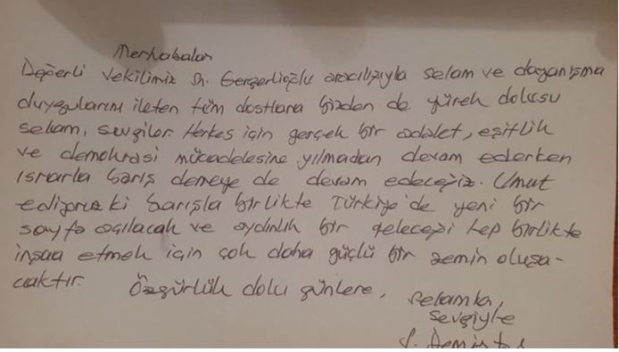 Türkiye'nin geleceğine dair umutlu olduğunu belirten Demirtaş, "Umut ediyoruz ki barışla birlikte Türkiye'de yeni bir sayfa açılacak ve aydınlık bir geleceği hep birlikte inşa etmek için çok daha güçlü bir zemin oluşacaktır" dedi. Demirtaş, mesajını "Özgürlük dolu günlere" sözleriyle tamamladı.