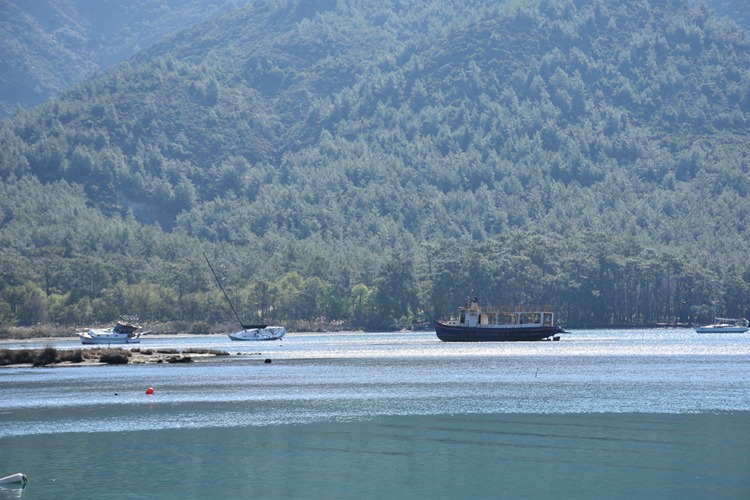 Adaköy Mahallesi Yalancıboğaz mevkisinde deniz suyunun çekilmesiyle kum adacığı oluştu, bölgede bulunan tekneler, salmalarının karaya oturması nedeniyle yan yattı.