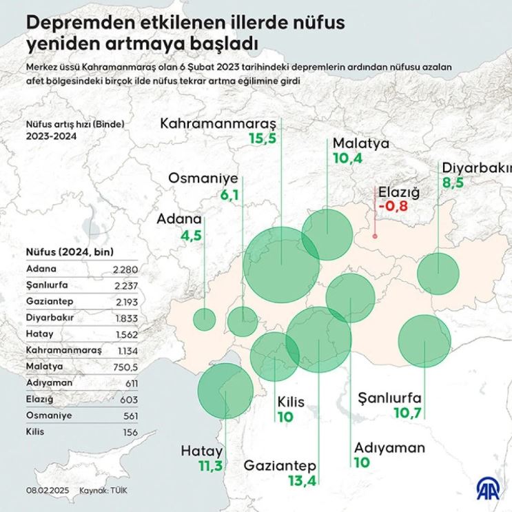 Merkez üssü Kahramanmaraş olan 6 Şubat 2023 tarihindeki iki yıkıcı depremin ardından nüfusu azalan afet bölgesindeki illerin tamamında 2025’te nüfus arttı.