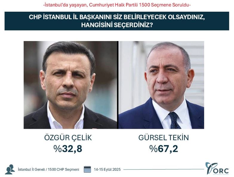1500 CHP'li seçmen ile İstanbul'da yapıldığı açıklanan ORC Araştırma'nın anketinde seçmenlere "Chp İl Başkanı'nı siz belirleyecek olsaydınız hangisini seçerdiniz?" sorusu yöneltildi.