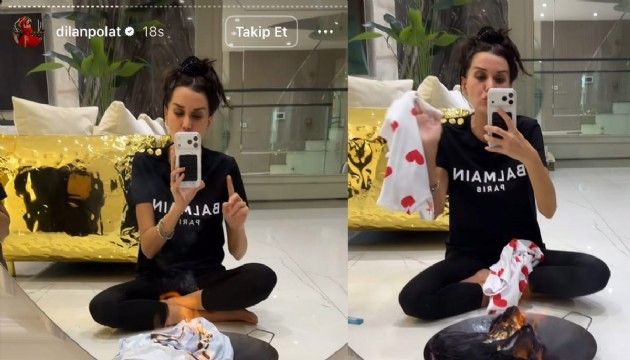 Sosyal medya hesabından paylaştığı videoda, Dilan Polat'ın salonun zeminine koyduğu bir tavanın içinde pijamalarını tutuşturduğu görüldü. Pijamaların kendisine ve ailesine uğursuzluk getirdiğini iddia eden ünlü fenomen, alevler yükselirken, "Çık hayatımızdan uğursuz, git" diyerek bağırdı.