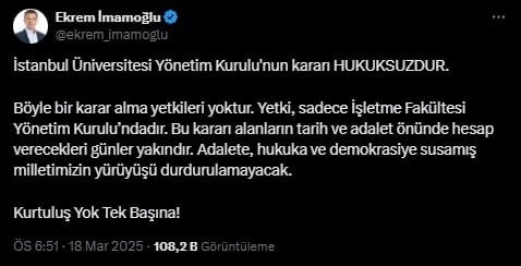 Böyle bir karar alma yetkisi yoktur. Yetki, sadece İşletme Fakültesi Yönetim Kurulu'ndadır. Bu kararın tarih ve adil önünde hesap verecekleri günler yakın. Adalete, hukuka ve demokrasiye susamış milletimizin yürüyüşü durdurulamayacak.