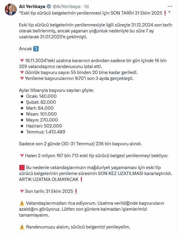 Yerlikaya'nın açıklamasına göre, bu süre son kez uzatılarak 31 Ekim 2025' ertelendi.