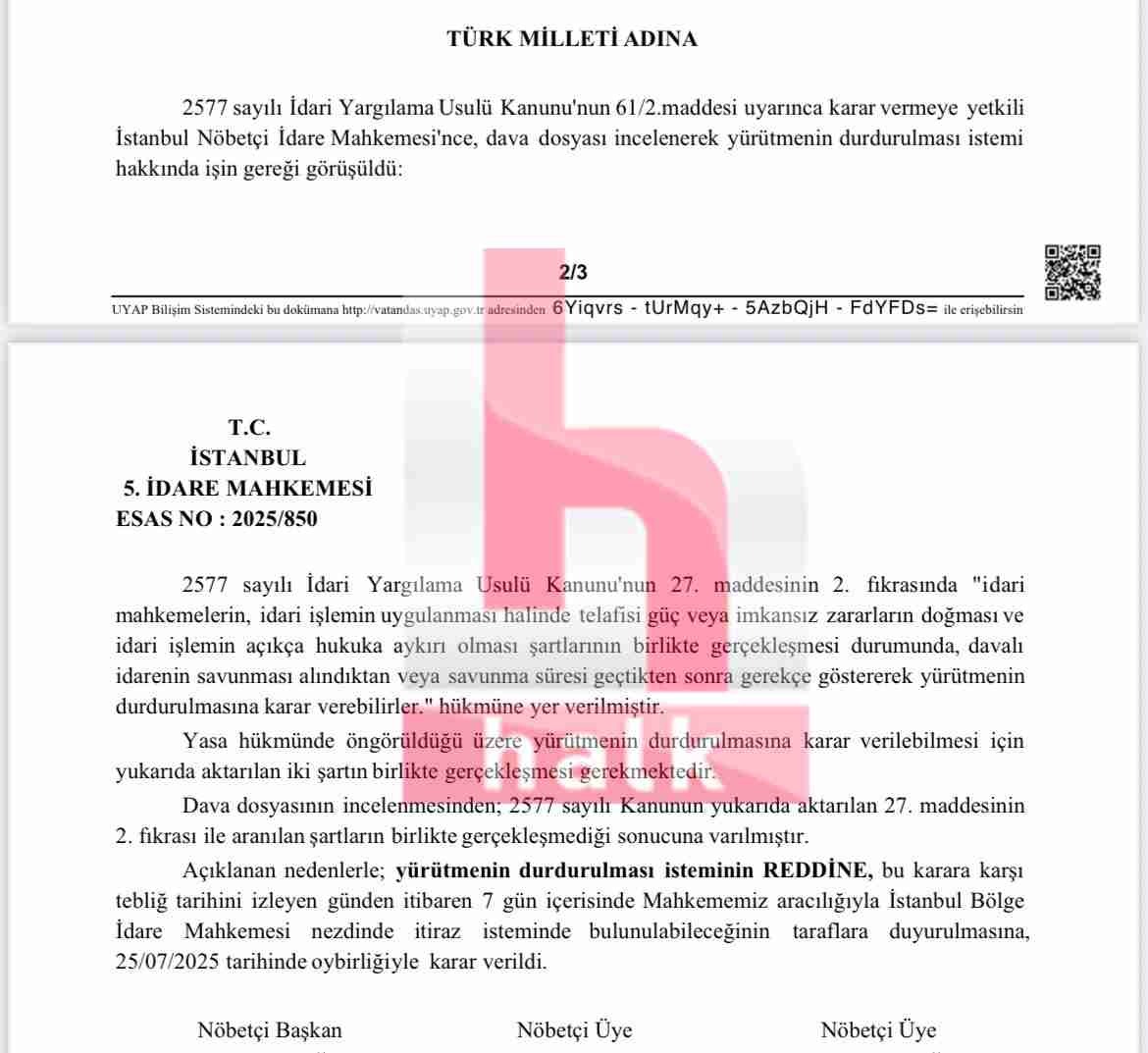 İstanbul Büyükşehir Belediye (İBB) Başkanı ve CHP’nin Cumhurbaşkanı adayı ve Ekrem İmamoğlu’nun diploma iptali davası İstanbul 5. İdare Mahkemesi'nde görülüyor. İmamoğlu’nun üniversite diplomasının iptaline ilişkin karar için yapılan yürütmenin durdurulması talebi, mahkeme tarafından reddedildi.