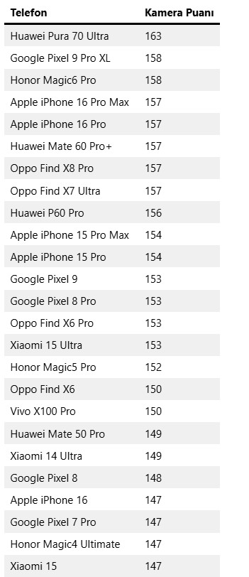 ABD'de 2019 yılında kara listeye alınan Huawei, DxOMark'ın kamera sıralamasında lider durumda. Çinli üretici Pura 70 Ultra modeli fotoğraf, zoom ve video gibi kriterlerde ortalama 163 puan alarak birinci sıraya yerleşti.