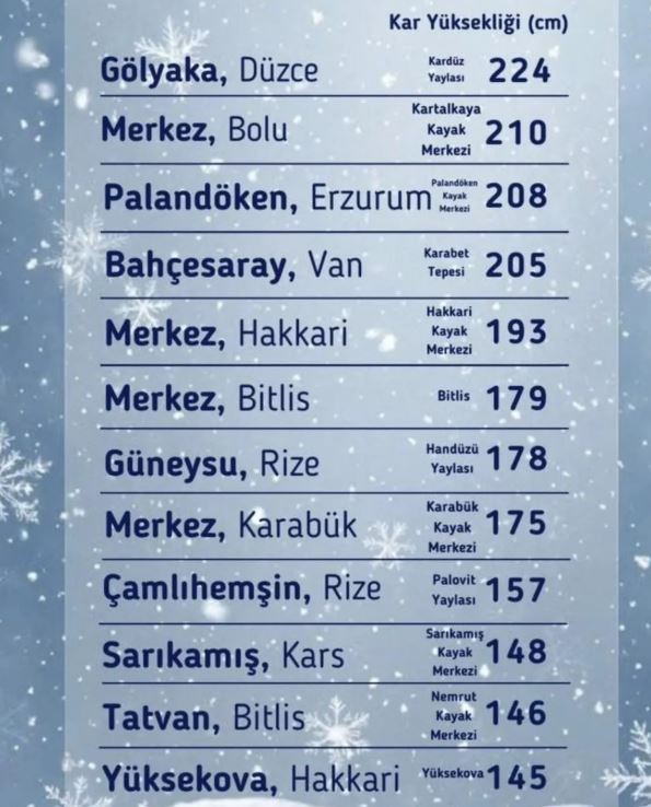 224 santimetre yükseklik ile birinci sıraya çıkan Kardüz Yaylasını, 210 santim ile Bolu Kartalkaya, 208 santim ile Erzurum Palandöken, 205 santim ile Van Bahçesaray Karabat tepesi, 193 santim ile Hakkari, 179 santim ile Bitlis, 178 santim ile Rize Güneysu Handüzü yaylası, 175 santim ile Karabük, 157 santim ile Rize Çamlıhemşin Palovit yaylası, 148 santim ile Kars Sarıkamış, 146 santim ile Bitlis Tatvan ve 145 santim ile Hakkari Yüksekova takip ediyor.