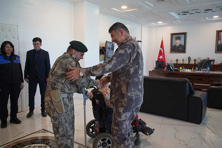 Burada görevli komiser ve özel harekat polisleriyle bir araya gelen bedensel engelli Akpınar, kullanılan zırhlı araçlar ve teçhizatlar hakkında bilgilendirildi.