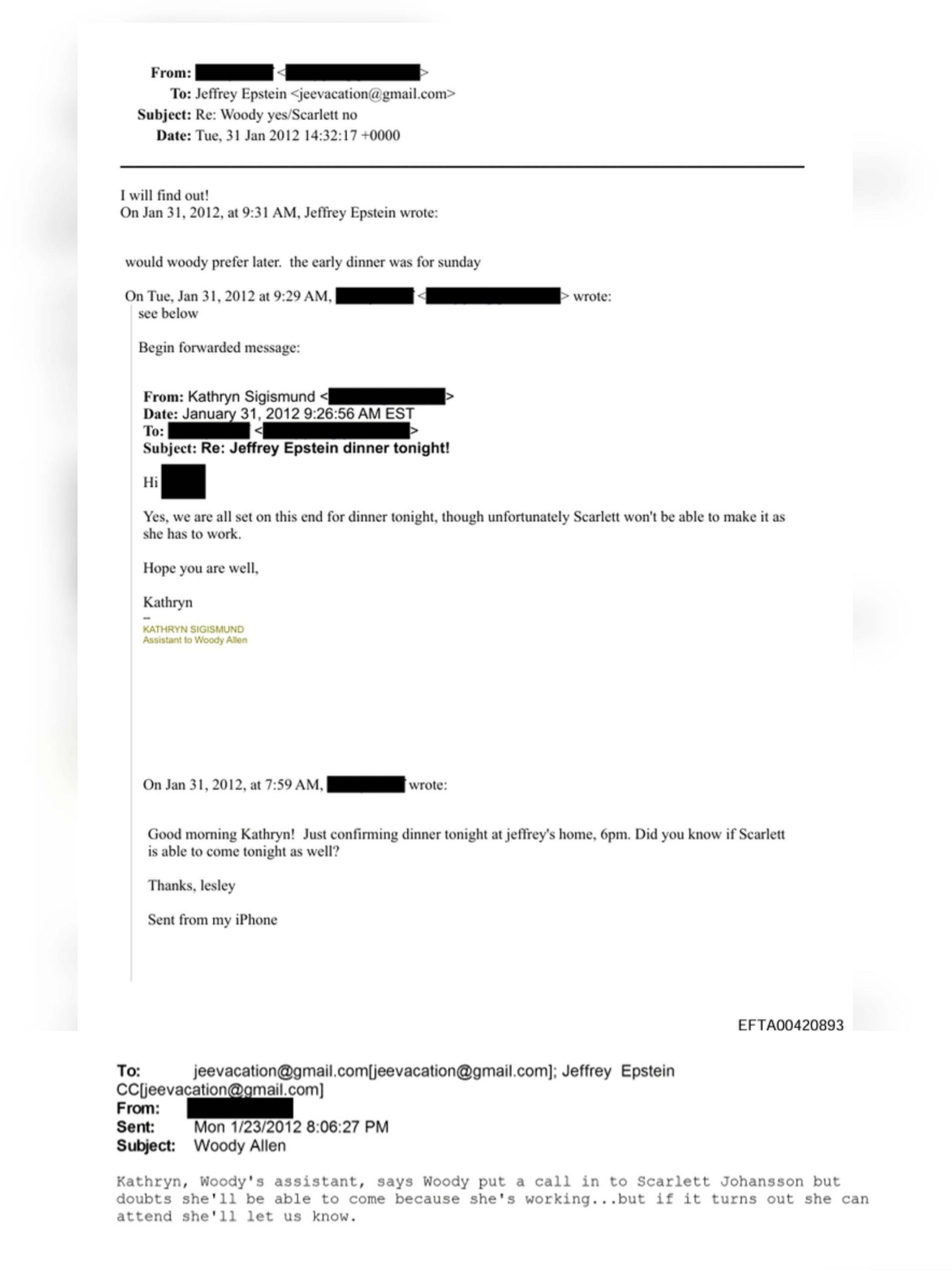 Dosyaların üçüncü dikkat çekici başlığı ise ünlü oyuncu Scarlett Johansson ile ilgili oldu. Belgelerde, Johansson’ın 2012 yılında yönetmen Woody Allen tarafından, Epstein’in adasında düzenlendiği belirtilen özel bir akşam yemeğine davet edildiği bilgisi yer aldı.