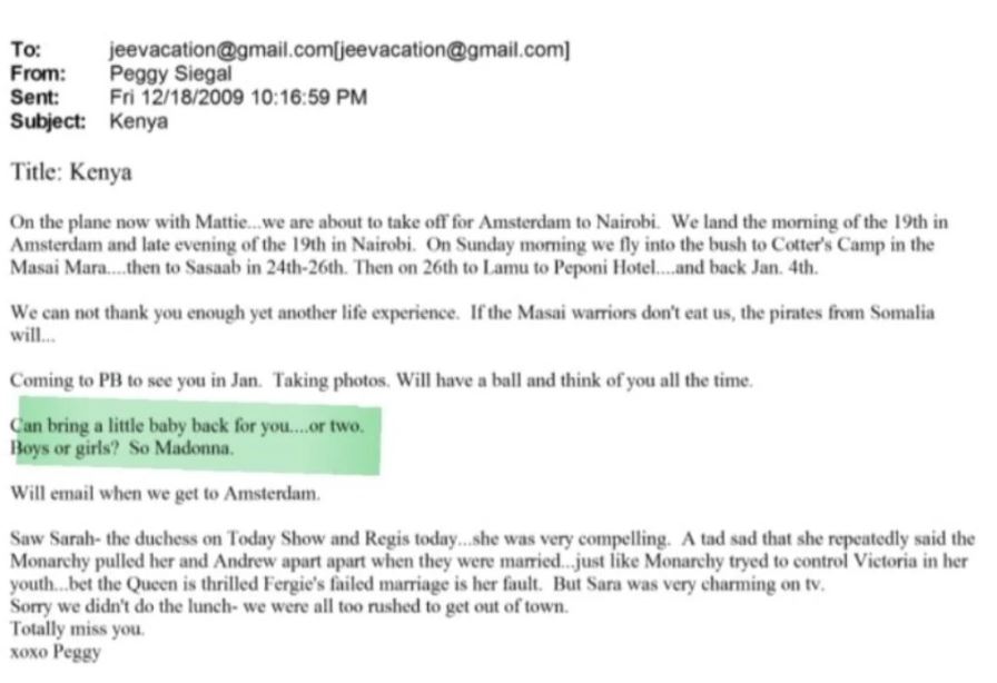 Siegal'ın e-postasında "Senin için bir ya da iki küçük bebek getirebilirim. Kız mı erkek mi? Tam Madonna gibi." ifadesi öne çıktı.