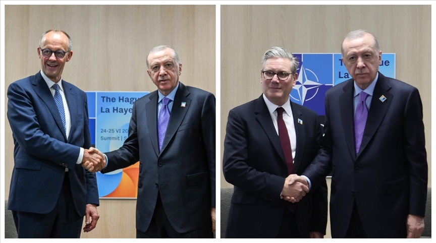 "Cumhurbaşkanımız Sayın Recep Tayyip Erdoğan, NATO Devlet ve Hükümet Başkanları Zirvesi için bulunduğu Lahey'de İngiltere Başbakanı Keir Starmer'ı kabul etti. Kabulde Türkiye ile İngiltere ikili ilişkileri, bölgesel ve küresel konular ele alındı. Cumhurbaşkanı Erdoğan kabulde, Türkiye ile İngiltere arasındaki ticaret hacmini 30 milyar dolar seviyesine çıkartma hedefiyle ilişkileri geliştirmeye devam edeceklerini, savunma sanayii başta olmak üzere her alanda iş birliğini artırmak için çalıştıklarını ifade etti.
