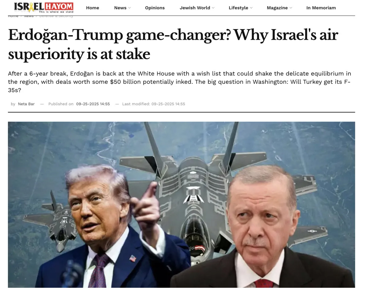 İsrail basınından Times of Israel, 2019’dan bu yana Erdoğan-Trump ilişkilerinin oldukça iyi gittiğini vurgularken, Türkiye’nin F-35 programına dahil olmasının İsrail açısından ciddi endişe yarattığını ve Tel Aviv’in bölgesel askeri üstünlüğünü koruması gerektiğini yazdı.