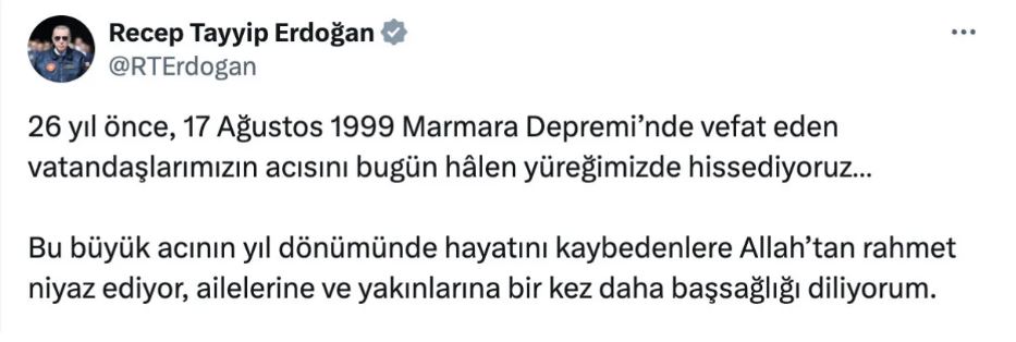 Cumhurbaşkanı Recep Tayyip Erdoğan, 17 Ağustos 1999 yılında gerçekleşen depremin yıl dönümüne ilişkin sosyal medya hesabından bir paylaşımda bulundu.