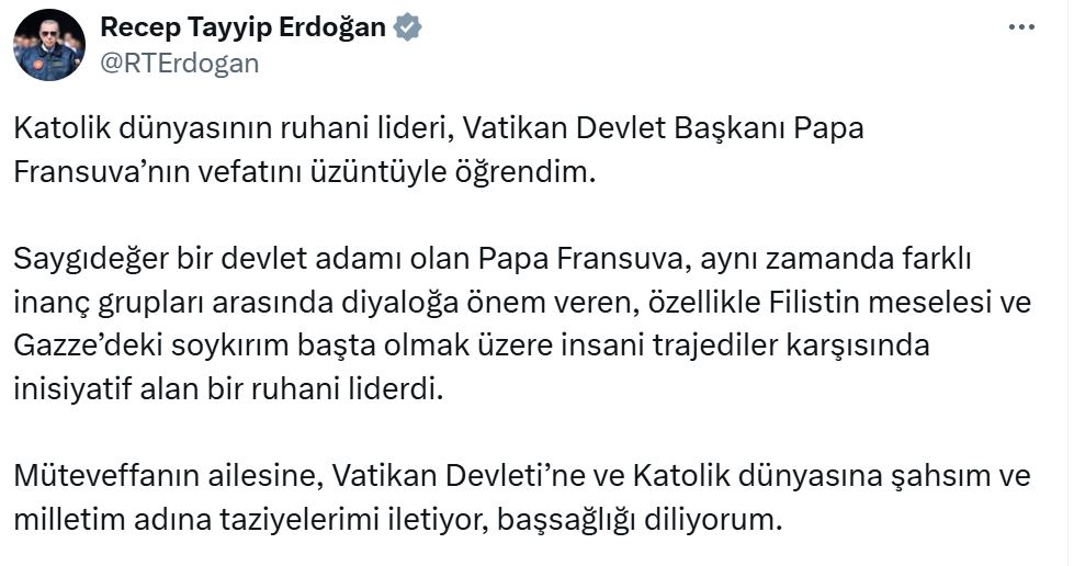 Cumhurbaşkanı Recep Tayyip Erdoğan, Katolik dünyasının ruhani lideri ve Vatikan Devlet Başkanı Papa Fransuva’nın hayatını kaybetmesi dolayısıyla taziye mesajı yayımladı. Sosyal medya hesabından yaptığı paylaşımda Erdoğan, vefat haberini üzüntüyle öğrendiğini belirtti.