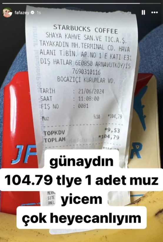 Farah Zeynep Abdullah sosyal medya hesabından, "Günaydın. 104.79 TL'ye 1 adet muz yiyeceğim. Çok heyecanlıyım" diyerek paylaşımda bulundu.