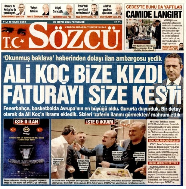 Fenerbahçe Başkanı Ali Koç'a eski bakanların baklava yedirdiği görüntülere yönelik yapılan haberlerin ardından KOÇ Grubunun Sözcü'ye reklam vermeyeceği öğrenildi.