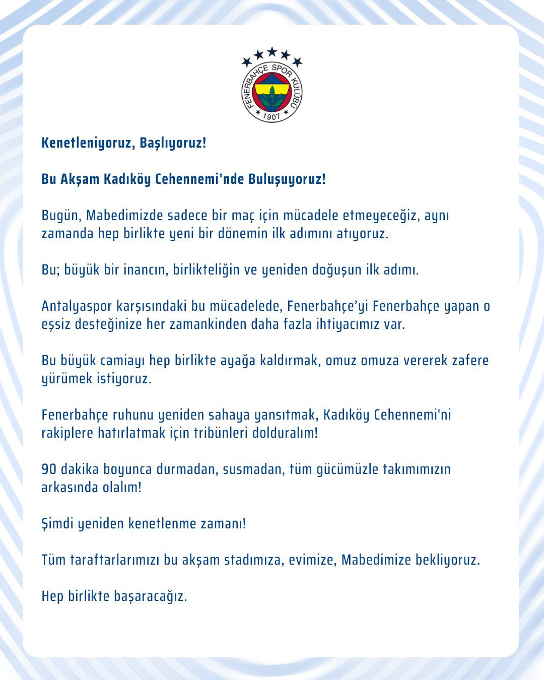 90 dakika boyunca durmadan, susmadan, tüm gücümüzle takımımızın arkasında olalım! Şimdi yeniden kenetlenme zamanı! Tüm taraftarlarımızı bu akşam stadımıza, evimize, Mabedimize bekliyoruz. Hep birlikte başaracağız."