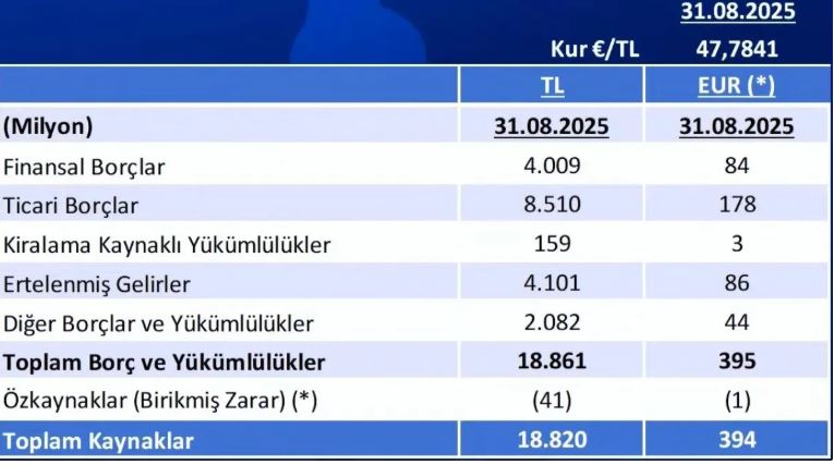 Buna göre 31 Ağustos 2025 itibarıyla Fenerbahçe'nin toplam borcu 395 milyon euro (19 milyar 252 milyon 250 bin TL) olarak açıklandı.