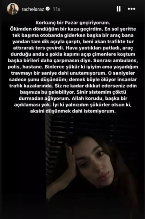 "En sol şeritte tek başıma otobanda giderken başka bir araç bana yandan tam dik açıyla çarptı. Beni akan trafikte tur attırarak ters çevirdi. Hava yastıkları patladı, araç durduğu anda o şokla kapımı açıp çimenlere koştum başka biri daha çarpmasın diye.