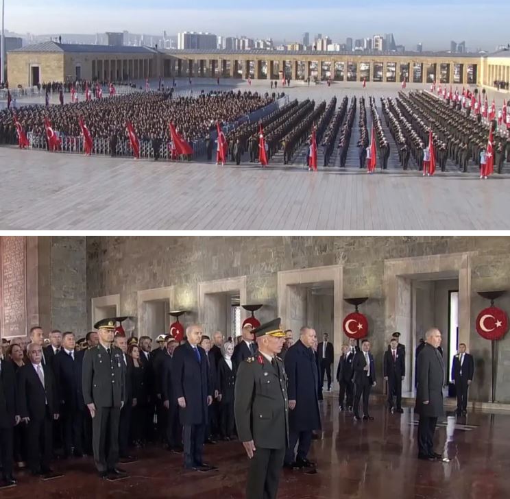 Cumhurbaşkanı Erdoğan, kırmızı beyaz karanfillerden oluşan ay yıldızlı çelengi, Atatürk'ün mozolesine bıraktı. Atatürk'ün 87 yıl önce vefat ettiği saat olan 09.05'te saygı duruşunda bulunuldu ve ardından İstiklal Marşı okundu.