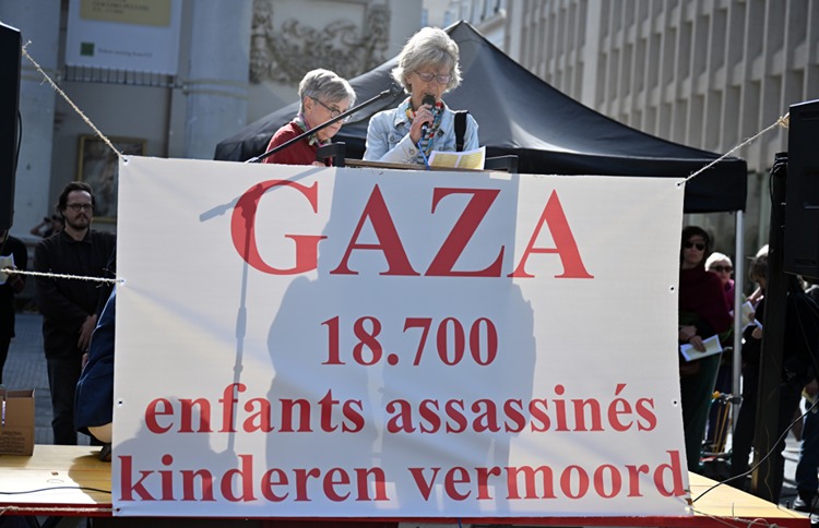 Brüksel'deki Kraliyet Tiyatrosu önünde bir araya gelen sanatçılar, "Gazze çocuklarının sessizliği" adını verdikleri gösteride 18 bin 700 çocuğun İsrail tarafından öldürüldüğünü belirtti.