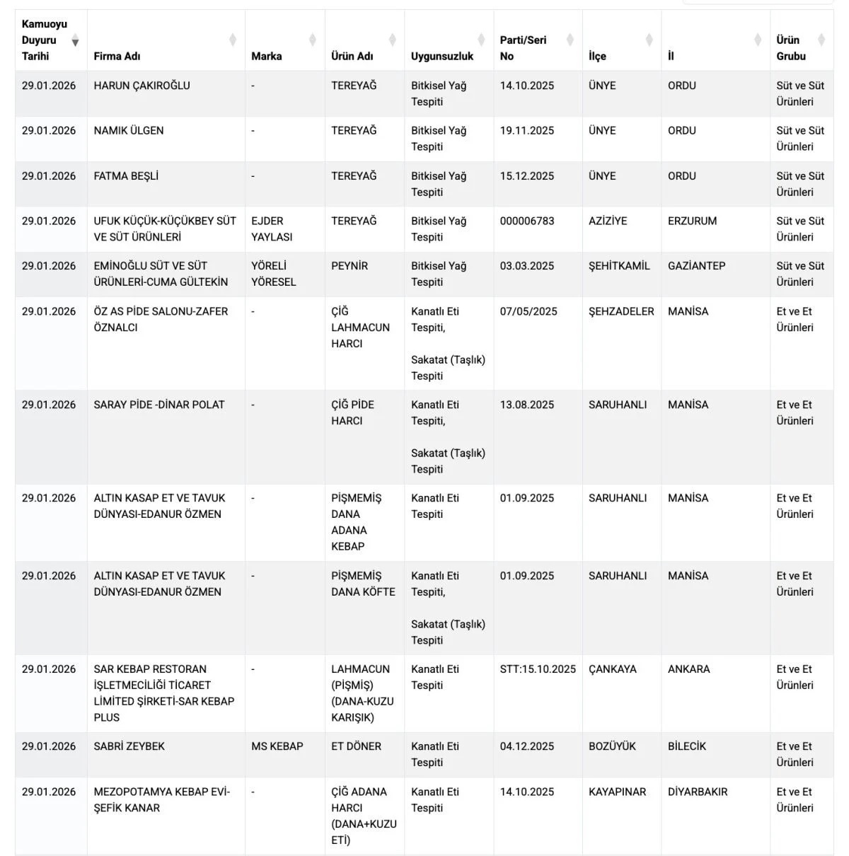 Bakanlığın 29 Ocak 2026 tarihli denetim sonuçlarına göre; pişmiş hamburger, dana köfte, kasap köfte, Adana kebap ve dana güveç iç harcı gibi ürünlerde, tüketiciye bildirilmeden kanatlı eti ve sakatat (taşlık) kullanıldığı belirlendi. Bu uygunsuzlukların İstanbul, Diyarbakır ve Kırıkkale’de faaliyet gösteren çeşitli işletmelerde tespit edildiği bildirildi.