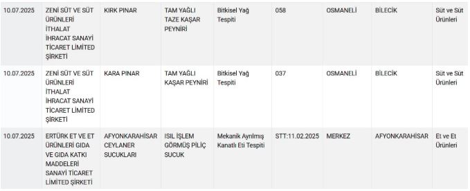 Tarım ve Orman Bakanlığı, ülke genelinde gerçekleştirdiği denetimlerin ardından gıda güvenliğini ihlal eden firmaları bir kez daha kamuoyuna duyurdu.