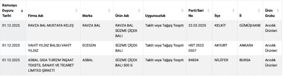 Son yapılan testlerde; Ravza Bal, Ecegün ve Asbal isimli markaların ürünlerinde taklit ve tağşiş yapıldığı tespit edildi.