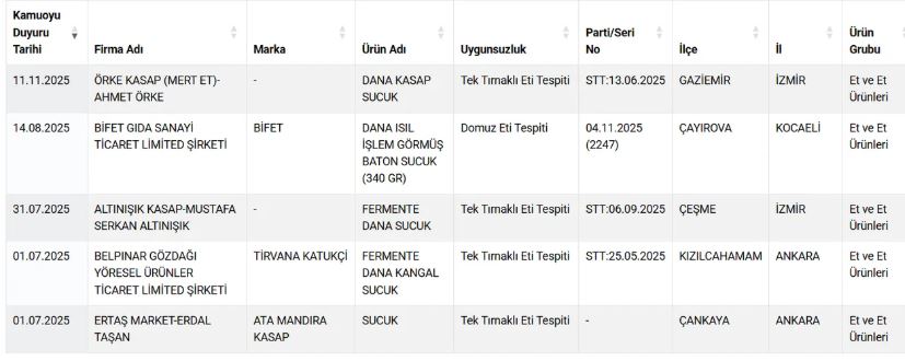 Listeye göre, domuz, at ve eşek etinden sucuk yapılması mide bulandırdı. "guvenilirgida.tarimorman.gov.tr" adresinden yayınlanan listede ünlü bir marka da yer aldı.