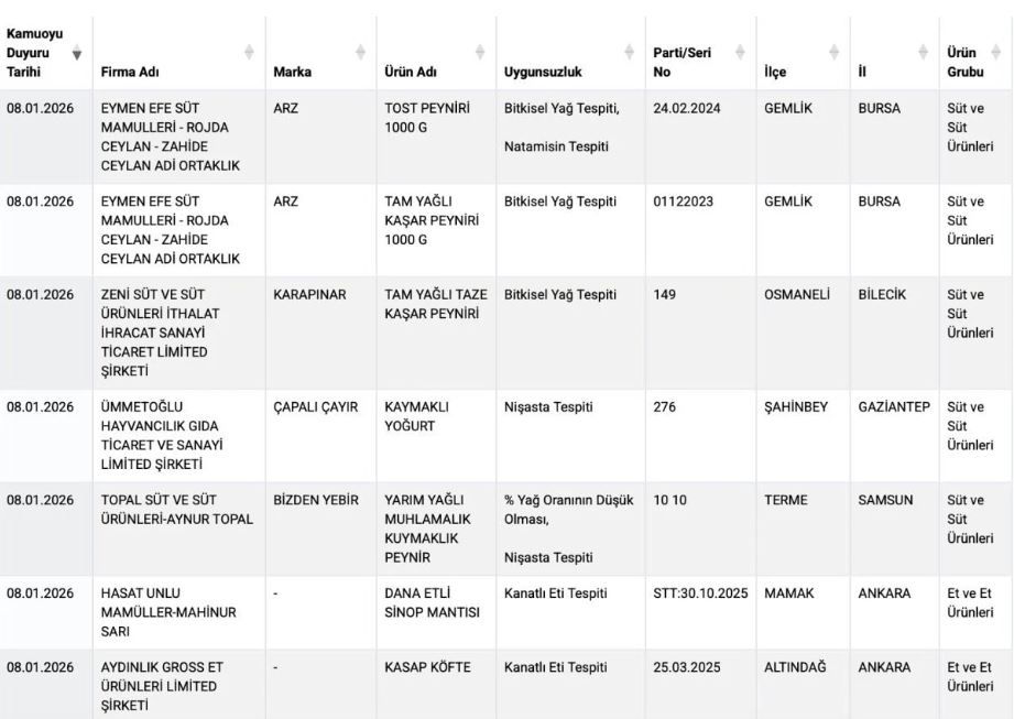 Güncellenen listede, günlük tüketimde sıkça yer alan bazı ürün gruplarında mevzuata aykırı uygulamaların tespit edildiği belirtildi.
