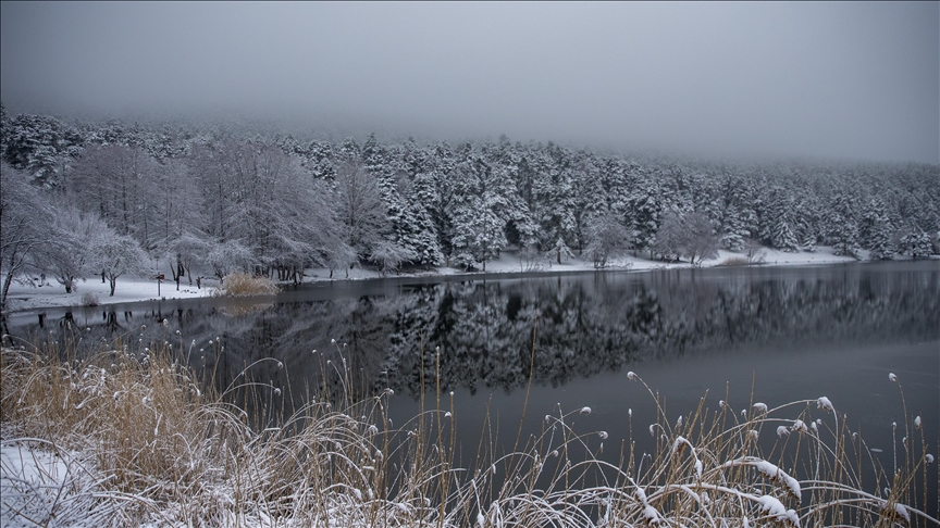 Kar yağışının ardından Gölcük'te kar kalınlığı 5 santimetreyi geçti. Hava sıcaklığının eksi derecelere düşmesiyle tabiat parkındaki gölün yüzeyi kısmen buz tuttu.