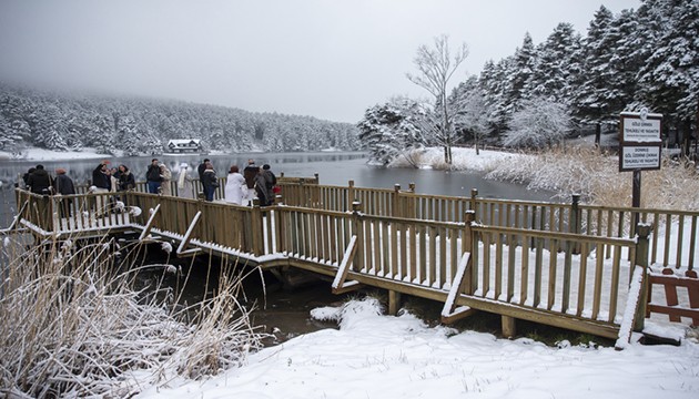 Günübirlik tatil için Gölcük'e gelen doğaseverler, göl çevresinde yürüyerek, iskelede fotoğraf çektirerek kar manzarasının tadını çıkardı. Beyaza bürünen tabiat parkı, havadan görüntülendi.