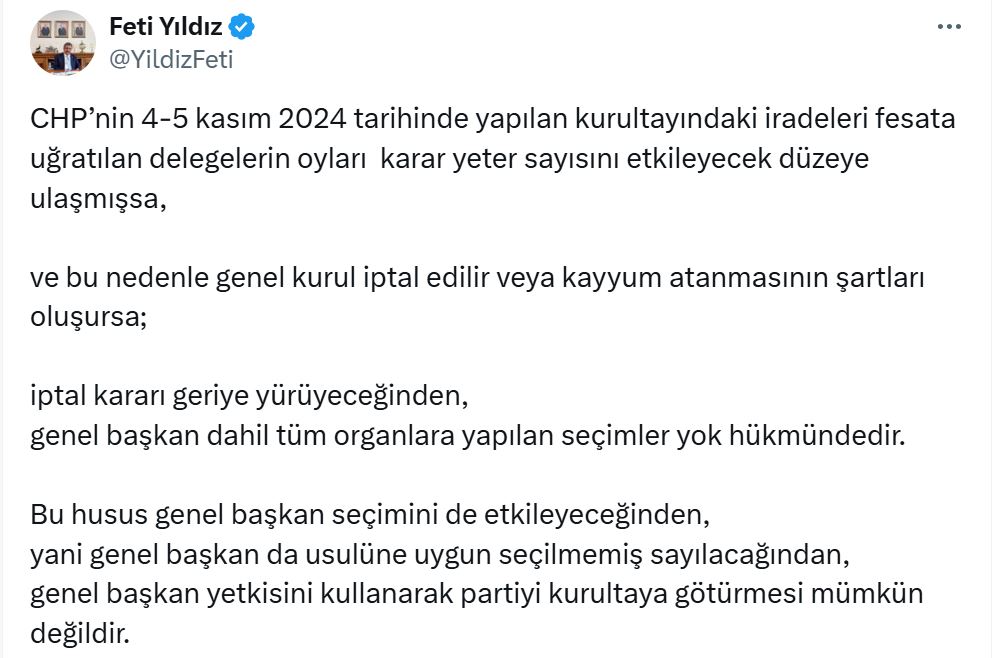 "CHP’nin 4-5 Kasım 2024 tarihinde yapılan kurultayındaki iradeleri fesata uğratılan delegelerin oyları karar yeter sayısını etkileyecek düzeye ulaşmışsa ve bu nedenle genel kurul iptal edilir veya kayyum atanmasının şartları oluşursa; iptal kararı geriye yürüyeceğinden, genel başkan dahil tüm organlara yapılan seçimler yok hükmündedir.