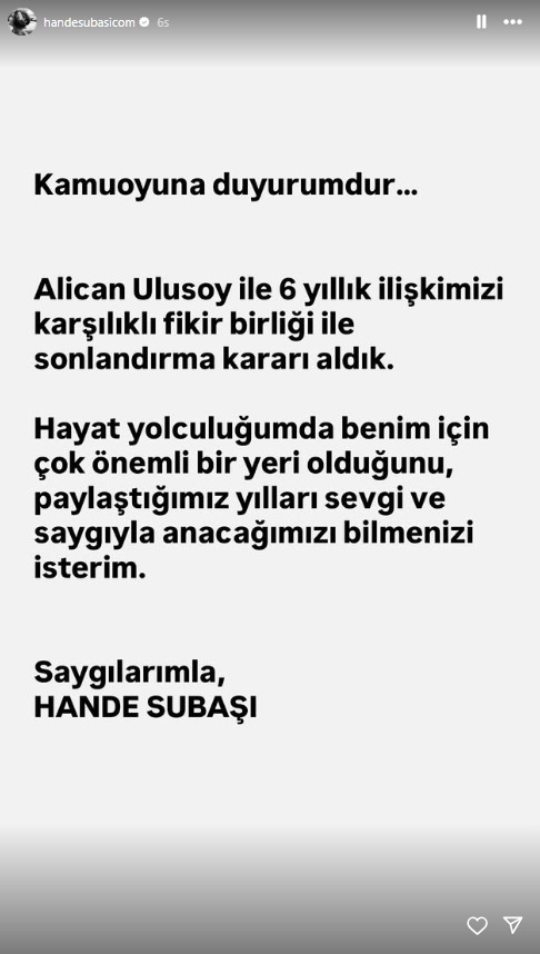 “Kamuoyuna duyurumdur... Alican Ulusoy ile 6 yıllık ilişkimizi karşılıklı fikir birliği ile sonlandırma kararı aldık. Hayat yolculuğumda benim için çok önemli bir yeri olduğunu, paylaştığımız yılları sevgi ve saygıyla anacağımızı bilmenizi isterim.”