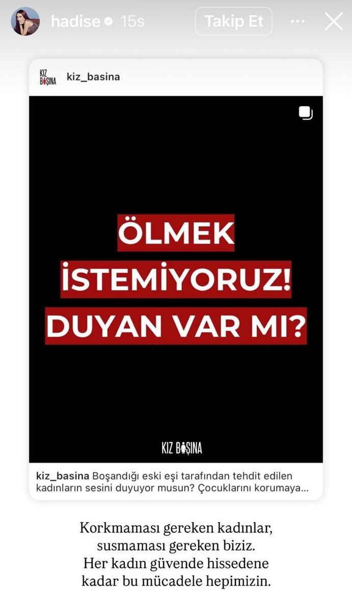 "Her gün kadınlar ölümle tehdit ediliyor. Her gün kadınlar korku içinde yaşıyor ama kadınlar değil, failler korkmalı" ifadelerini içeren mesajı paylaşan Hadise, şu ifadeleri kullandı: Korkmaması gereken kadınlar, susmaması gereken biziz. Her kadın güvende hissedene kadar bu mücadele hepimizin.
