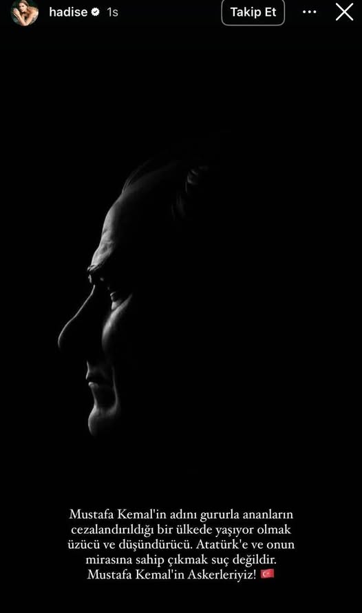 Sosyal medyadan bu karara tepki yağarken teğmenlere destek mesajları geldi. Şarkıcı Hadise'de Instagram hesabından yaptığı paylşaımda Hadise, "Mustafa Kemal'in adını gururla ananların cezalandırıldığı bir ülkede yaşıyor olmak üzücü ve düşündürücü. Atatürk'e ve onun mirasına sahip çıkmak suç değildir. Mustafa Kemal'in askerleriyiz! ifadelerini kullandı.