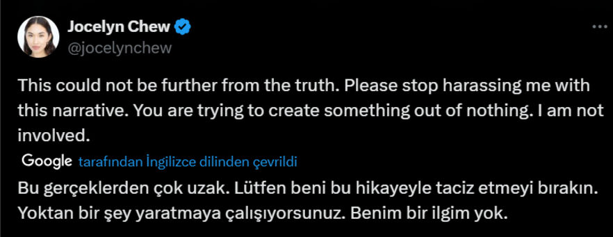 Hakan Sabancı ile Hande Erçel'in ayrılmasına neden olarak gösterilen Jocelyn Chew, söz konusu iddiaları şu şekilde yalanladı; "Bu iddia, gerçeklerden çok uzak. Lütfen beni bu hikâyeyle taciz etmeyi bırakın. Yoktan bir şey yaratmaya çalışıyorsunuz. Benim hiçbir ilgim yok."