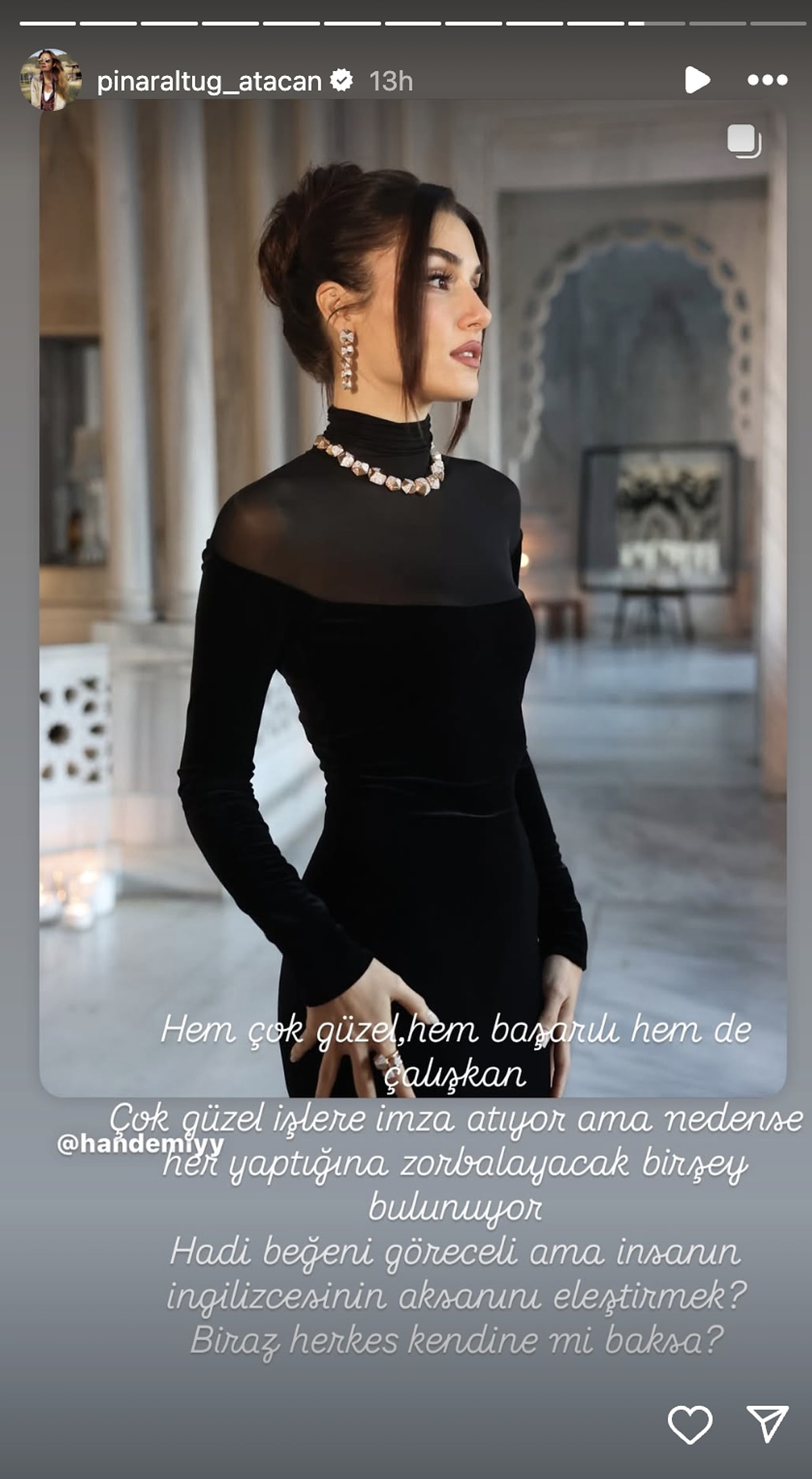 Sosyal medyada yapılan yorumlara Pınar Altuğ da sessiz kalmadı.Instagram hesabından paylaşım yapan oyuncu, Erçel'e yöneltilen eleştirilere şu sözlerle tepki gösterdi, "Hem çok güzel, hem başarılı, hem de çalışkan. Çok güzel işlere imza atıyor ama nedense her yaptığına zorbalayacak bir şey bulunuyor. Hadi beğeni göreceği ama insanın İngilizcesinin aksanını eleştirmek? Biraz herkes kendine mi baksa?"