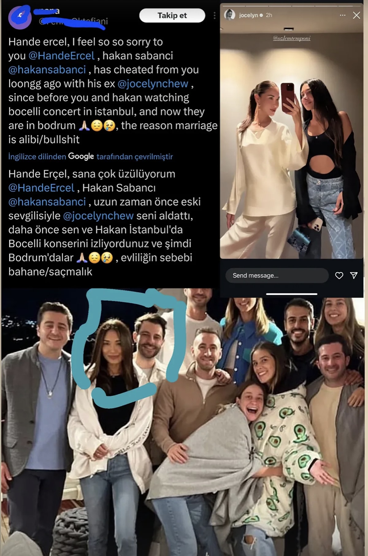 En dikkat çeken gelişme, sosyal medyada yapılan bir yorumla başladı. Hakan Sabancı'nın eski aşkı Jocelyn Chew'in arkadaşı olduğunu iddia eden bir kullanıcı, Sabancı'nın hala Chew ile arkadaş olduğunu öne sürerek Hande Erçel'e "Senin için çok üzülüyorum" şeklinde bir mesaj gönderdi.