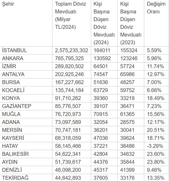 Cnbc-e'nin haberine göre, Türkiye'de en çok döviz mevduatı bulunan şehir İstanbul. BDDK'nın FinTürk veri tabanından derlenen bilgilere göre, İstanbul'da toplam 2 trilyon 575 milyar 235 milyon TL'lik toplam döviz mevduatı bulunuyor. İstanbul'da kişi başına düşen döviz mevduatı 2024'te 164 bin TL. 2023'te bu rakam 15 bin 324 TL iken son 1 yıldaki artış yüzde 5.59.