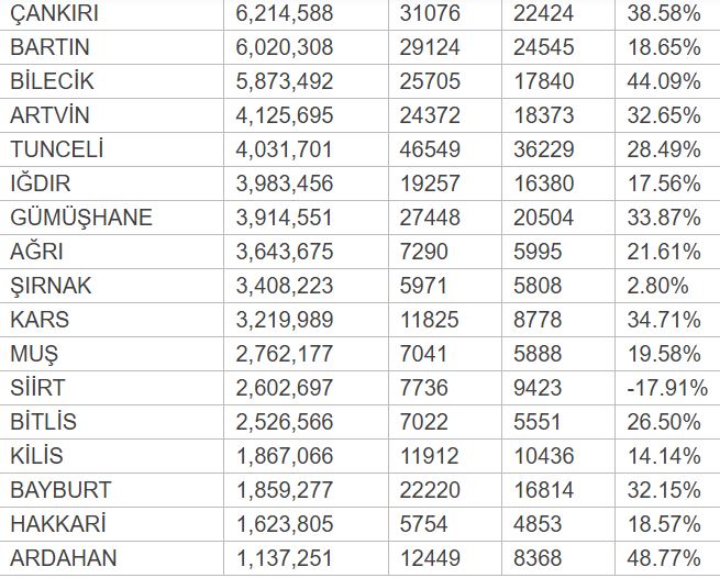 Türkiye genelinde son 1 yılda kişi başına düşen döviz mevduatı tutarını en fazla artıran il ise Batman. Batman'da toplam 9 milyon 640 bin liralık mevduat bulunurken, son 1 yıldaki artış oranı yüzde 50.41. İkinci sırada yer alan Ardahan'ın ardından ise yüzde 44,09 ile üçüncü olarak Bilecik bulunuyor. Bilecik'teki toplam döviz mevduatı 5 milyon 873 bin 492 lira.