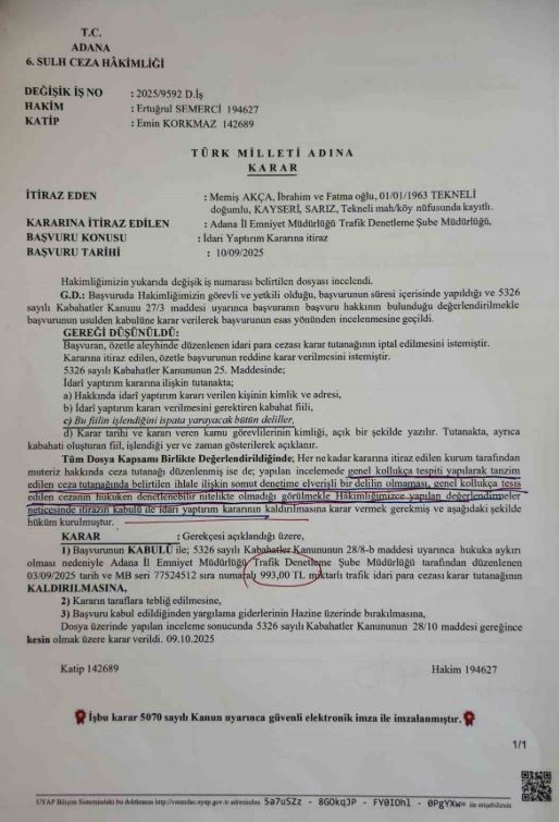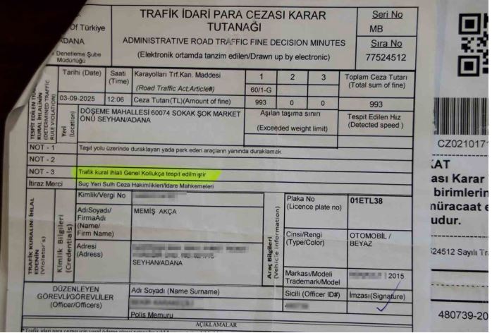 Adana’nın Seyhan ilçesinde yaşayan Memiş Akça’ya, geçtiğimiz eylül ayında aracını hatalı park ettiği gerekçesiyle 993 TL idari para cezası kesildi. Ceza tutanağını inceleyen kızı, avukat Nazan Akça Subaşı, cezayı düzenleyen kişinin trafik polisi değil, genel kolluk personeli olduğunu fark etti. Bunun üzerine Subaşı, babası adına Adana 6. Sulh Ceza Hâkimliği’ne itirazda bulundu.