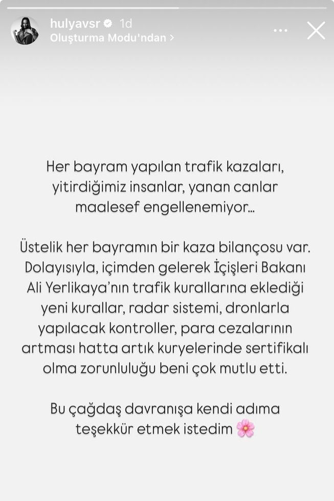 Hülya Avşar, alınan tedbirlerin ardından İçişleri Bakanı Ali Yerlikaya'ya teşekkür etti. Avşar; "Her bayram yapılan trafik kazaları, yitirdiğimiz insanlar, yanan canlar maalesef engellenemiyor... Üstelik her bayramın bir kaza bilançosu var. Dolayısıyla, içimden gelerek İçişleri Bakanı Ali Yerlikaya'nın trafik kurallarına eklediği yeni kurallar, radar sistemi, dronlarla yapılacak kontroller, para cezalarının artması hatta artık kuryelerinde sertifikalı olma zorunluluğu beni çok mutlu etti. Bu çağdaş davranışa kendi adıma teşekkür etmek istedim" açıklamasını yaptı.