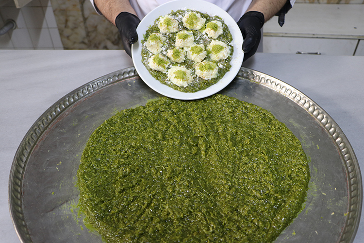 Çiğ kadayıfın yağla kavrulduktan sonra ocaktaki tepsiye yerleştirilerek 5 dakika ısıtıldığını aktaran Bekan, "Tepsiye toz şeker, fıstık ve tereyağı ilave ediyoruz. Yaklaşık 10-15 dakika pişirildikten sonra kıvamlı hale gelinceye kadar karmalarız. Daha sonra tepsiye açıp üzerine Kilis'e özgü kaymak, pudra şekeri, tarçın ve fıstık ilave ederek servise hazır hale getiriyoruz." dedi.