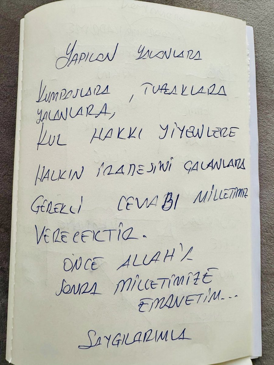 "Yapılan yalanlara, kumpaslara, tutsaklara, kul hakkı yiyenlere, halkın iradesini çalanlara gerekli cevabı milletimiz verecektir. Önce Allah'a sonra milletimize emanetim. Saygılarımla."