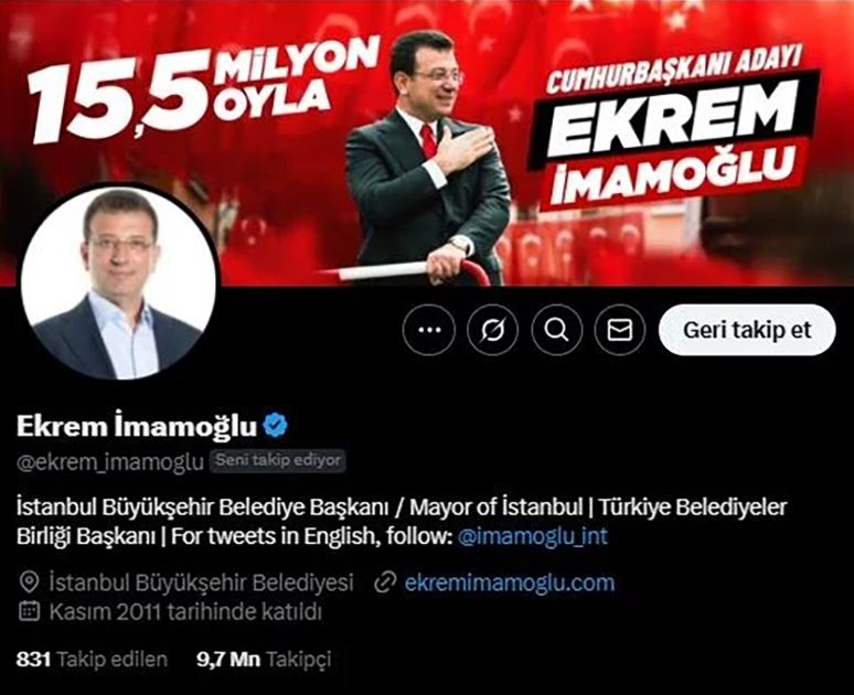 Cumhuriyet Halk Partisi’nin (CHP) vatandaşın doğrudan katılımıyla gerçekleştirdiği cumhurbaşkanlığı aday belirleme sürecinde 15,5 milyon oy alarak resmi aday ilan edilen İstanbul Büyükşehir Belediye Başkanı Ekrem İmamoğlu, sosyal medya hesaplarında dikkat çekici bir değişikliğe gitti.