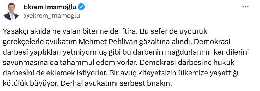 İmamoğlu, "Yasakçı akılda ne yalan biter ne de iftira. Bu sefer de uyduruk gerekçelerle avukatım Mehmet Pehlivan gözaltına alındı. Demokrasi darbesi yaptıkları yetmiyormuş gibi bu darbenin mağdurlarının kendilerini savunmasına da tahammül edemiyorlar. Demokrasi darbesine hukuk darbesini de eklemek istiyorlar. Bir avuç kifayetsizin ülkemize yaşattığı kötülük büyüyor. Derhal avukatımı serbest bırakın" ifadelerini kaydetti.