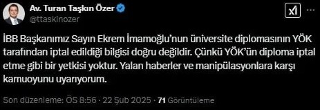 "İBB Başkanımız Sayın Ekrem İmamoğlu’nun üniversite diplomasının YÖK tarafından iptal edildiği bilgisi doğru değildir. Çünkü YÖK’ün diploma iptal etme gibi bir yetkisi yoktur. Yalan haberler ve manipülasyonlara karşı kamuoyunu uyarıyorum."