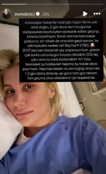 Şarkıcı İrem Derici sosyal medya hesabından korkutan bir açıklamada bulundu. Hasta yatağında bir fotoğraf paylaşan ünlü isim "Arkadaşlar haberler nasıl çıktı hiçbir fikrim yok ama doğru, 2 gün önce Aerro'cuğumun stüdyosunda kayıttayken epileptik nöbet geçirip, kitlenip bayılmışım" ifadelerini kullandı.