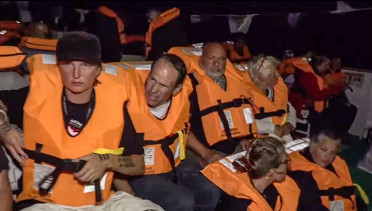 Yayında, anonslar sonrası gemilerdeki katılımcıların önceden belirlenen acil durum protokollerine göre can yeleklerini giyerek oturmuş halde beklediği görüldü.