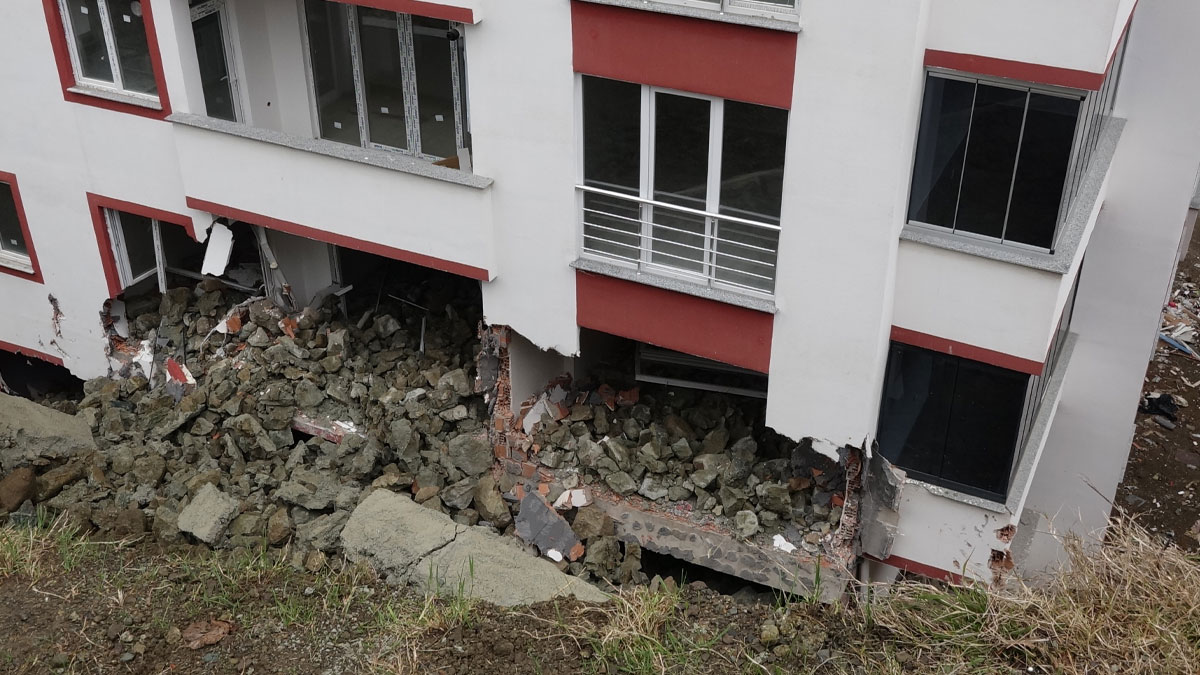 Trabzon’un Yomra ilçesine bağlı Sancak Mahallesi’nde çöken istinat duvarı iki dairede hasara yol açtı.